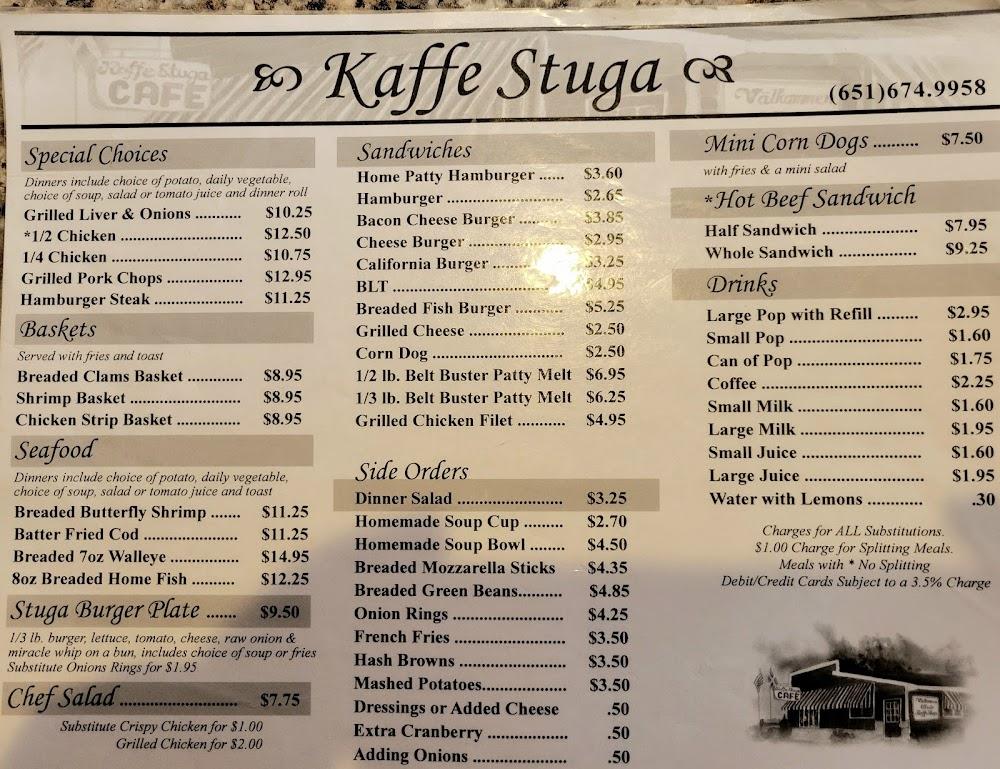 The menu at Kaffe Stuga offers a wide array of classic American dishes. Breakfast shines with options like fluffy pancakes, hearty breakfast sandwiches, and classic hash browns. Lunchtime favorites include sandwiches like the Stuga Burger and delicious hot beef sandwiches. Dinner features meals like chicken fried steak and shrimp baskets prepared simply yet delightfully. Don't miss the small plates for sharing, especially the iconic mozzarella sticks. The dessert selection boasts homemade pies that provide a sweet touch to any meal. Overall, the menu caters to many tastes while maintaining a focus on comfort food.