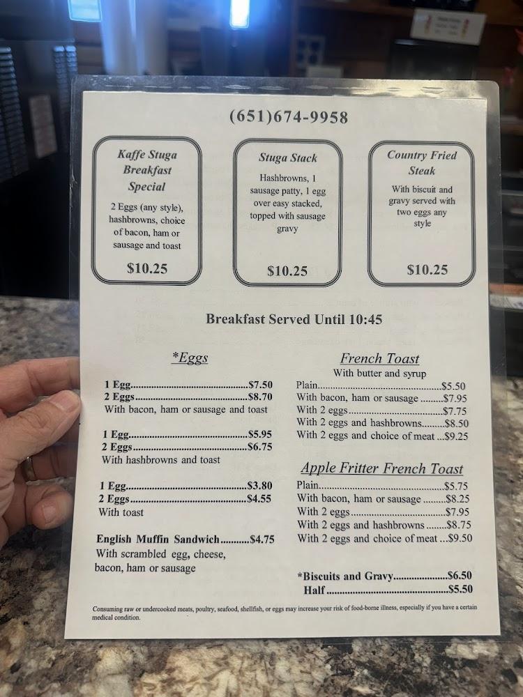 Welcome to Kaffe Stuga Restaurant, a charming dining destination in Harris, MN, where warm hospitality meets delicious American cuisine. Enjoy our extensive breakfast, lunch, and dinner menus, featuring local specialties, excellent coffee, and delectable desserts. With a relaxed atmosphere ideal for solo diners, families, and groups, we offer convenient takeout, delivery, and dine-in options. Our fully accessible facilities ensure everyone can enjoy a meal in comfort. Whether you're stopping by for a quick bite or a leisurely brunch, Kaffe Stuga is the perfect spot to savor quality food in a welcoming environment. Visit us at 43821 Forest Blvd or call +1 651-674-9958 to make a reservation!